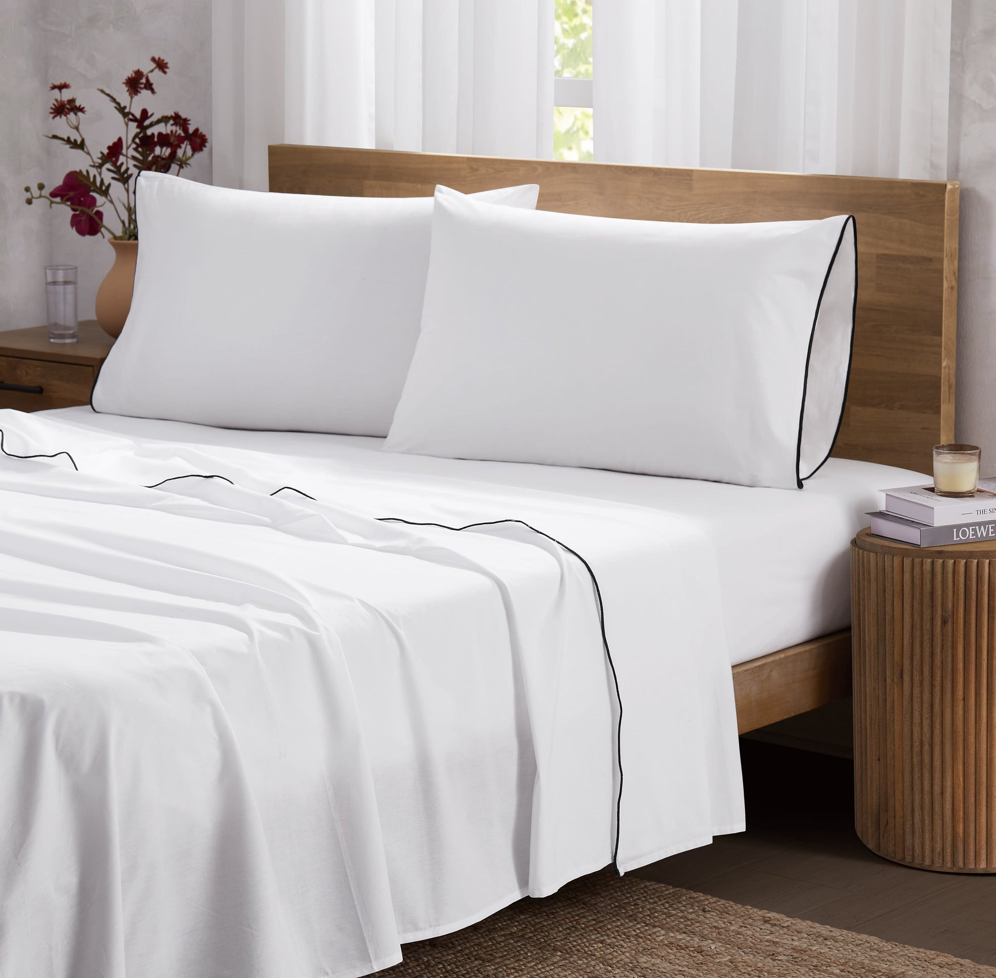 The merrowed edge detailing adds a refined finish along the hems, lending a modern touch to a classic design. Available in versatile colorways—White and Black, White and Brown, White and Chalk, White and Green, White and Grey, and White and Navy—these sheets offer options to complement both neutral palettes and bold bedroom styles. Whether you prefer understated elegance or a pop of contrast, there’s a set to match your taste.
