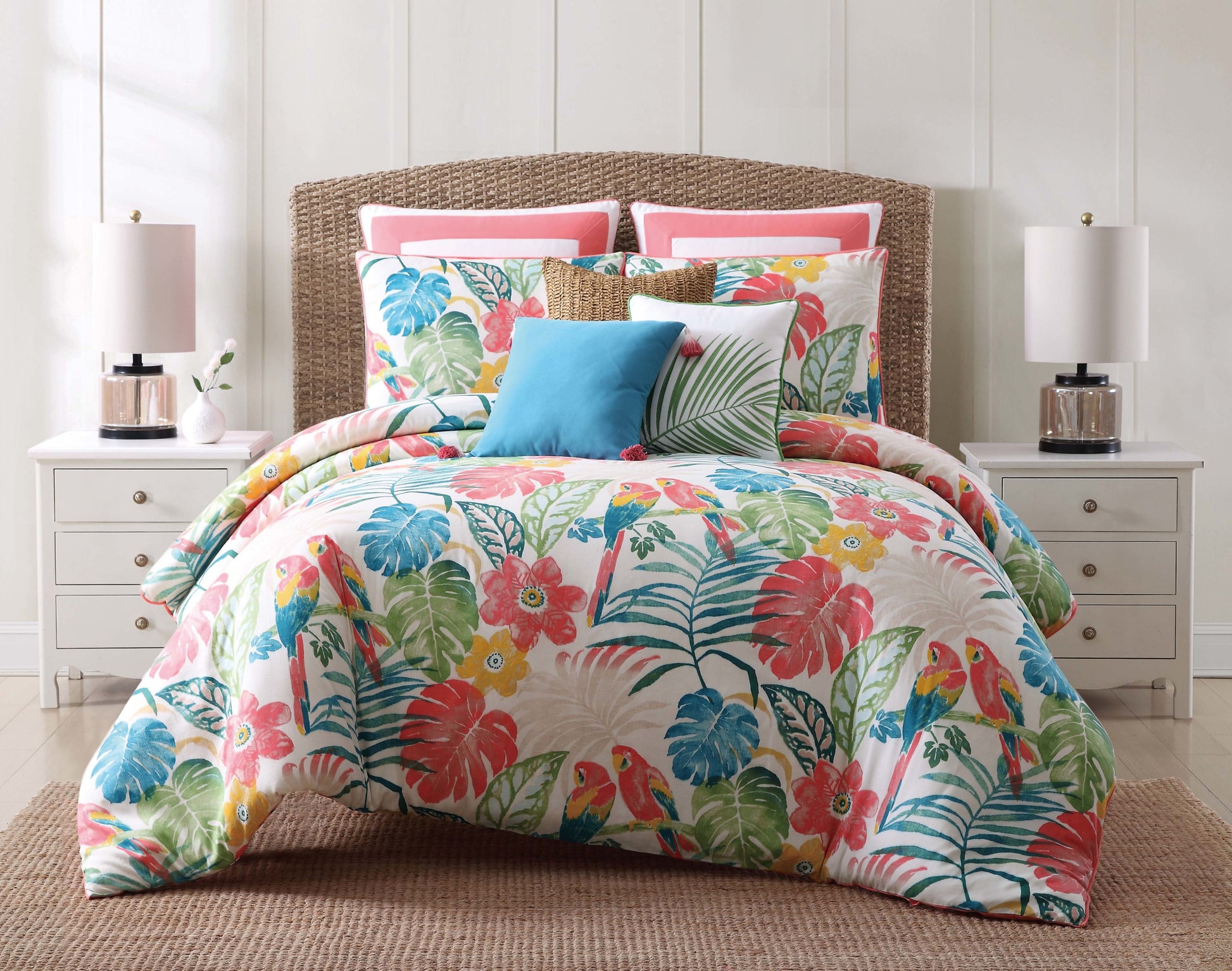 Bright palm prints dominated by a coral color with printed parrots hidden in the main face fabric of the comforter and shams. This pattern is printed on a 100% cotton fabric and is fully accessorized. The casual feel take you back to the beach place with those lazy days and warm nights.