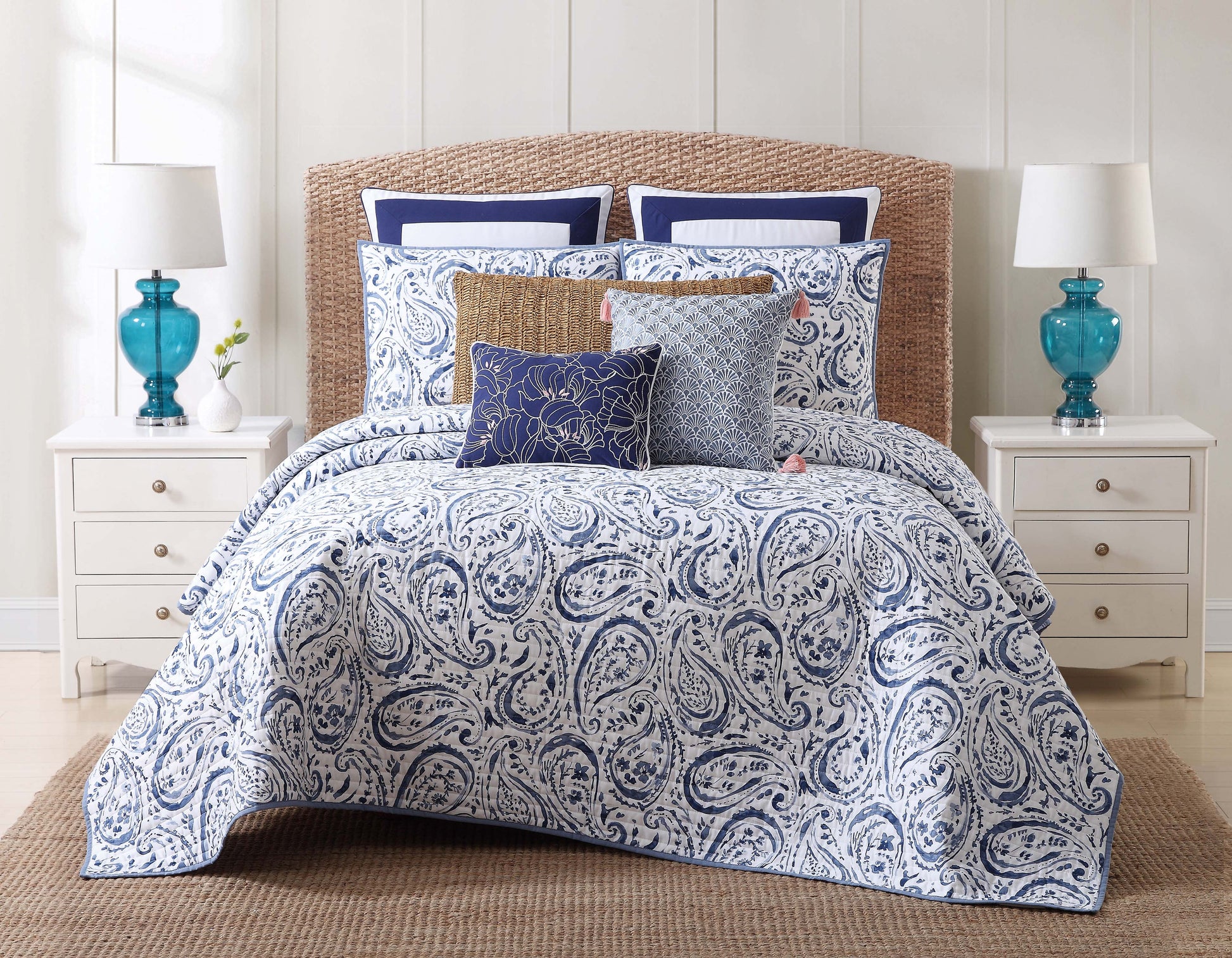 White base paisley print in dusty blue shades in 100% cotton face and back fabrics. This pattern is fully accessorized to help you complete the look of the room.