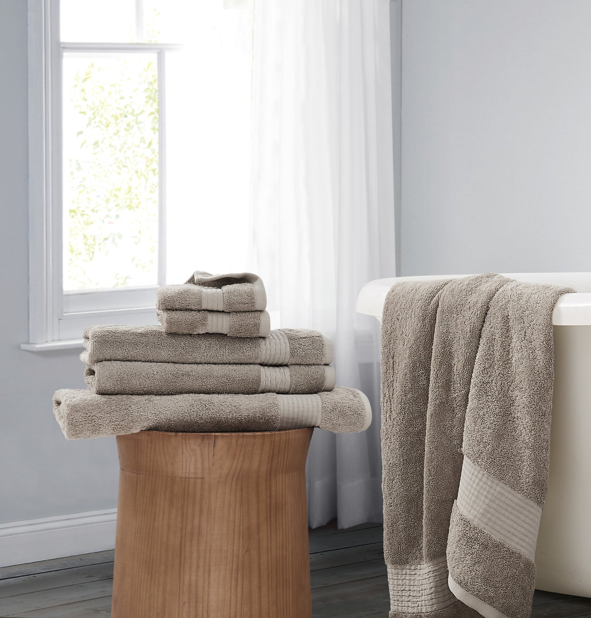 The Brooklyn Loom Cotton TENCEL™ Towel Set presents the perfect balance between softness and durability. The unique properties of TENCEL™ Lyocell fibers allow for a long lasting towel that is absorbent and quick drying, with all the benefits of soft and smooth cotton. From sourcing to production, TENCEL™ is made with sustainability in mind by using environmentally responsible practices. This six piece set features two wash cloths (12”W x 12”L), two hand towels (16”W x 28”L), and two bath towels (30”W x 54”L) with a dobby style border offered in white, grey, khaki, blush, sage green and blue.Includes two bath towels (30"W x 54"L), two hand towels (16"W x 28"L), two wash cloths (12"W x 12"L)Fabric is a combed and ring spun 60% cotton 40% TENCEL™ blendThis set is machine washable.