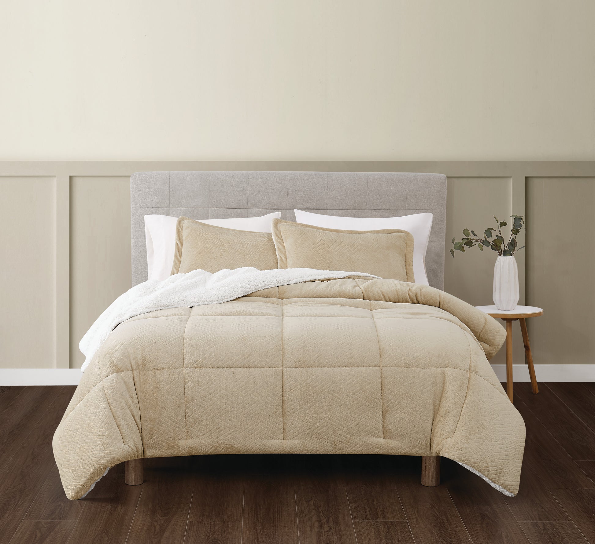 Indulge in luxury with our plush comforter set, available in a range of fashionable colors. Crafted from 200 GSM face fabric, it features a basket weave carved pattern that adds depth to your bed, complemented by a large-scale box stitch for enhanced texture. The reverse side offers a solid off-white color in soft, cozy sherpa fleece fabric, ensuring warmth and comfort. Soft yet durable, this comforter is designed to withstand regular use while maintaining its luxurious feel. It proudly carries the OEKO-TEX Standard 100 certification, guaranteeing safety and sustainability in its materials. With over a decade of expertise, Truly Soft is a trusted brand known for delivering exceptional value through high-quality home products.