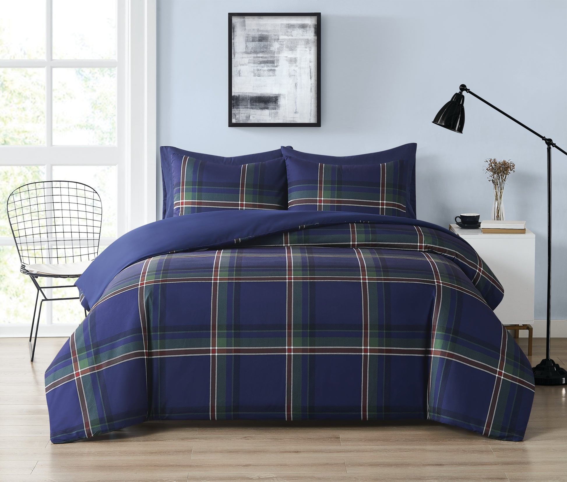 This dramatic dark blue based printed plaid is a statement piece in any bedroom. The blue base has a printed plaid overlay with black, green and red lines. The reverse is a solid color from our extensive Truly Soft collection. This item can be machine washed but please be sure to use properly sized machinery to care for the item. Made with the global sustainability you care about, this item is certified OEKO-TEX Standard 100 with certification number SH025 144503 as certified by TESTEX AG, Swiss Textile Testing Institute.Includes one duvet cover (90"W x 90"L) and two standard shams (20"W x 26"L). Comforter insert is not included.Face and back fabric are 100% brushed microfiber polyester. Shams use the same 100% brushed microfiber fabrics.This item is machine washable; however, please take care to use the appropriate size machinery.This item is manufactured and imported from China.