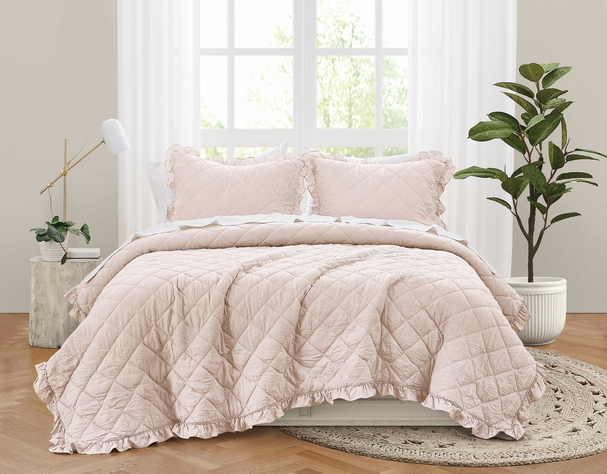 The Truly Soft Quilt Set is made with 100% crinkle microfiber on the face and reverses to a smooth solid microfiber back, giving you two soft sides to enjoy. The delicate ruffle trim adds a touch of femininity, perfect for fans of cottagecore, shabby chic, or romantic farmhouse styles. Filled with 100% polyester, this quilt is lightweight and breathable, making it ideal for use on its own in warmer months or layered with other bedding in cooler seasons. The soft blush colorway brings subtle warmth to your décor, while the reversible design allows for effortless styling changes.