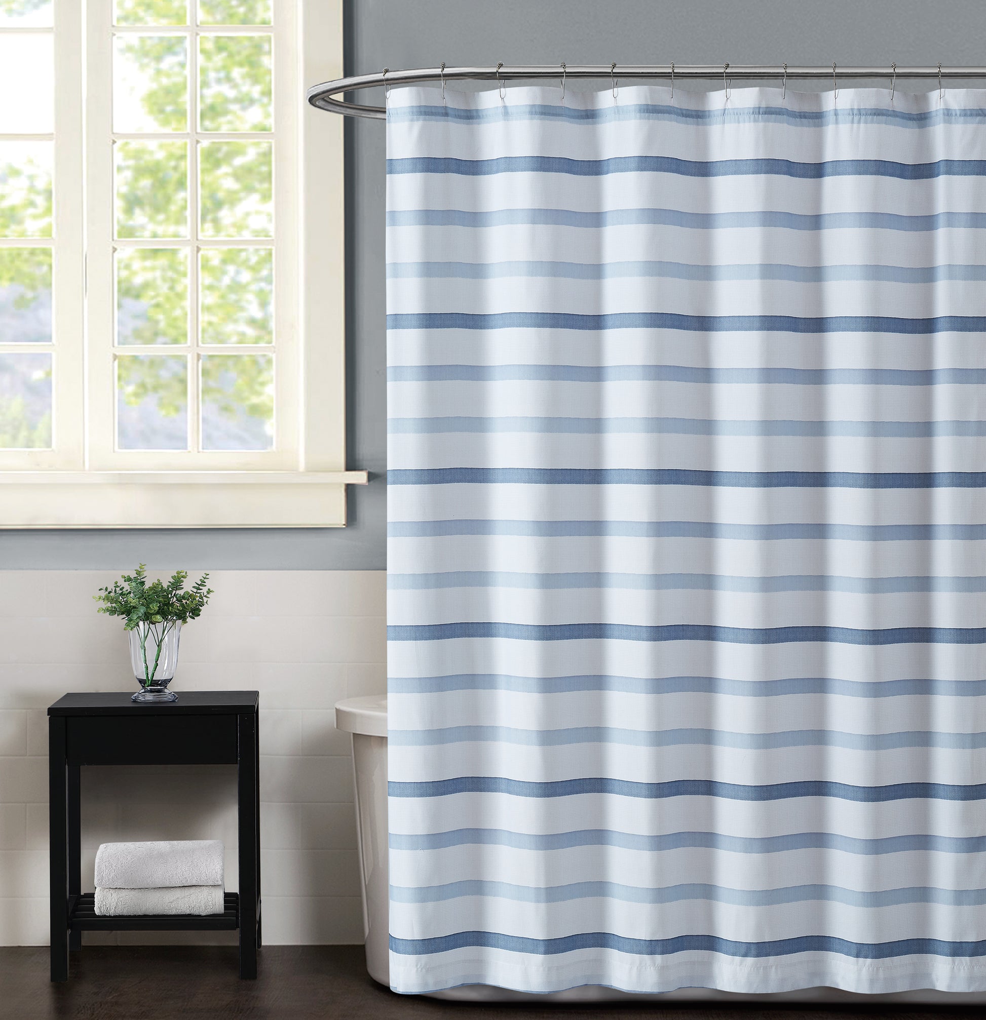 A clean and casual horizontal stripe is the focus for this bed. The printed texture emulates a yarn dyed look for added depth. The pattern is dominated by blue and gray shades on a white background. Items feature Truly Soft face and back material with for softness and performance you can count on. Bedding items reverse to a solid blue shade. All items are machine washable.Includes one shower curtain (72x72 inches)The fabric is 100% brushed microfiber with our special Truly Soft treatment.This item is machine washable, but please be sure to use appropriate sized machinery to avoid any excess wear on the items.This item is imported from China.